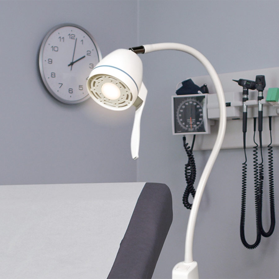 Cette lampe d'examen, livrée avec le pied roulant télescopique (60-100 cm), est destinée à des petits soins et examens mineurs en médecine générale.