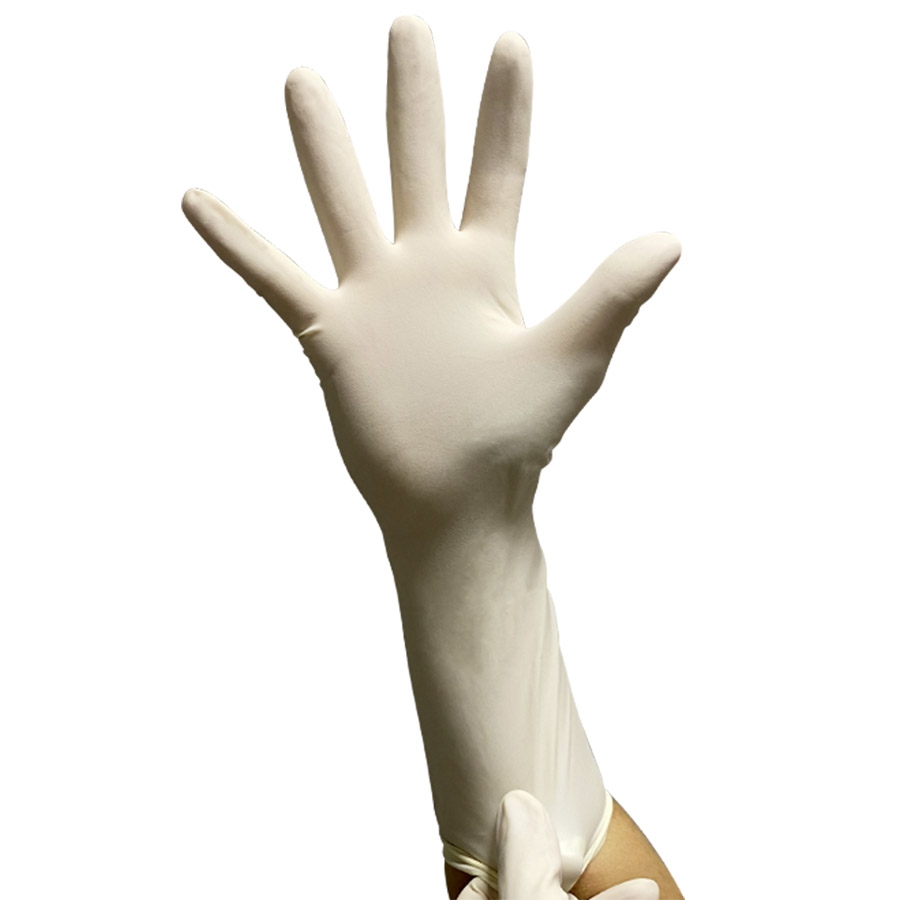 Gant ambidextre hypoallergénique avec manchette longue à bord droit.