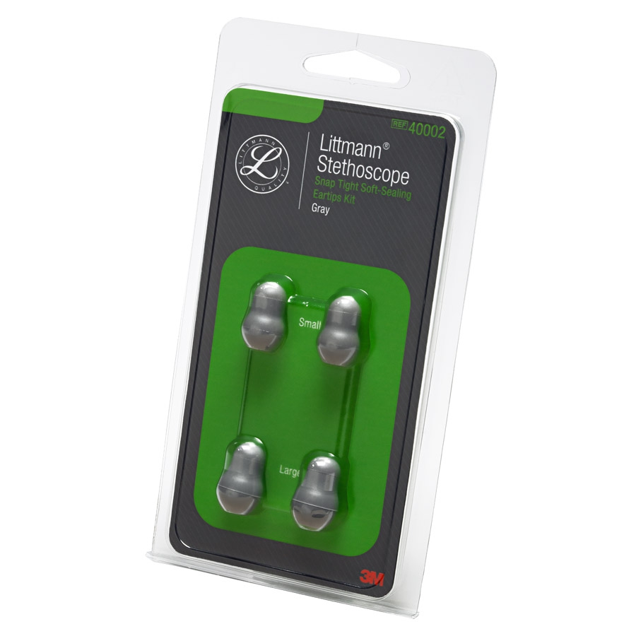 Kit d'embouts auriculaires de couleur grise s’utilisant exclusivement sur les stéthoscopes 3M™ Littmann. Il s’agit d’embouts auriculaires en silicone garantissant une excellente qualité acoustique. Ils se clipsent facilement sur les lyres des modèles Littmann.