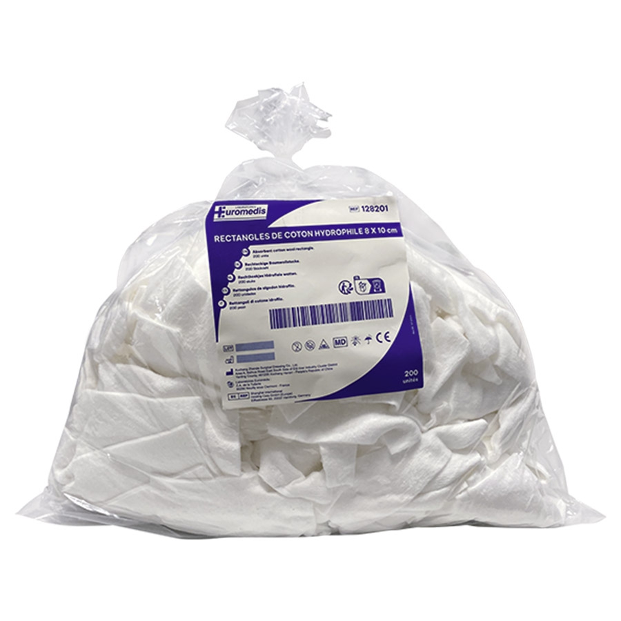 Conditionnement : sachet de 200 rectangles de coton 8 x 10 cm.