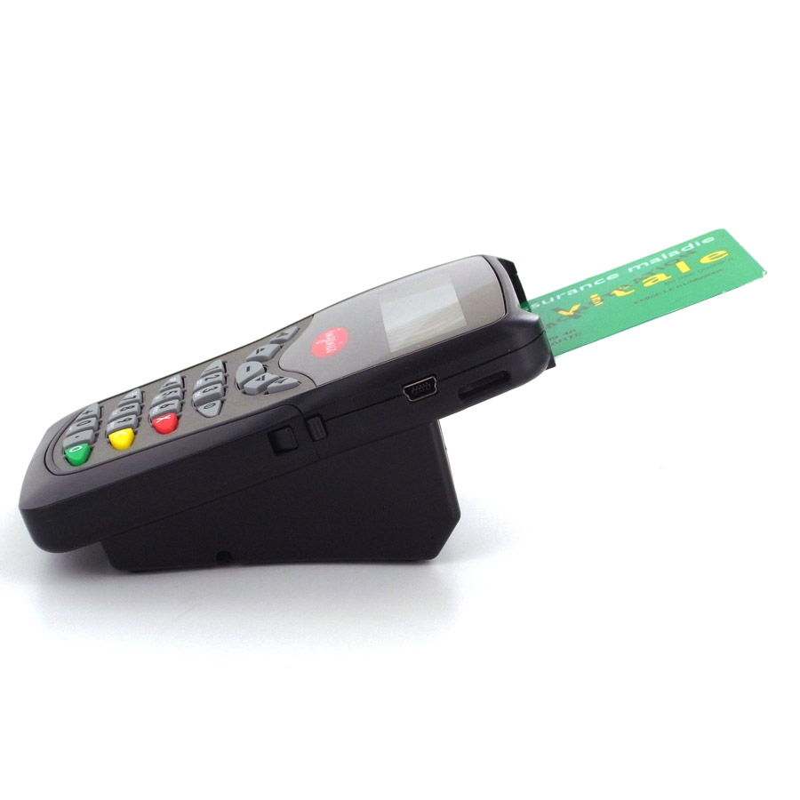 Le premier, doté d'une fente permet l'insertion facile de la carte Vitale (CV1 & CV2); le second sous l'appareil lit la carte professionnelle pour l'authentification et les vérifications de sécurité.