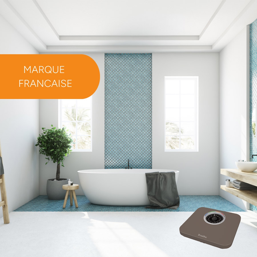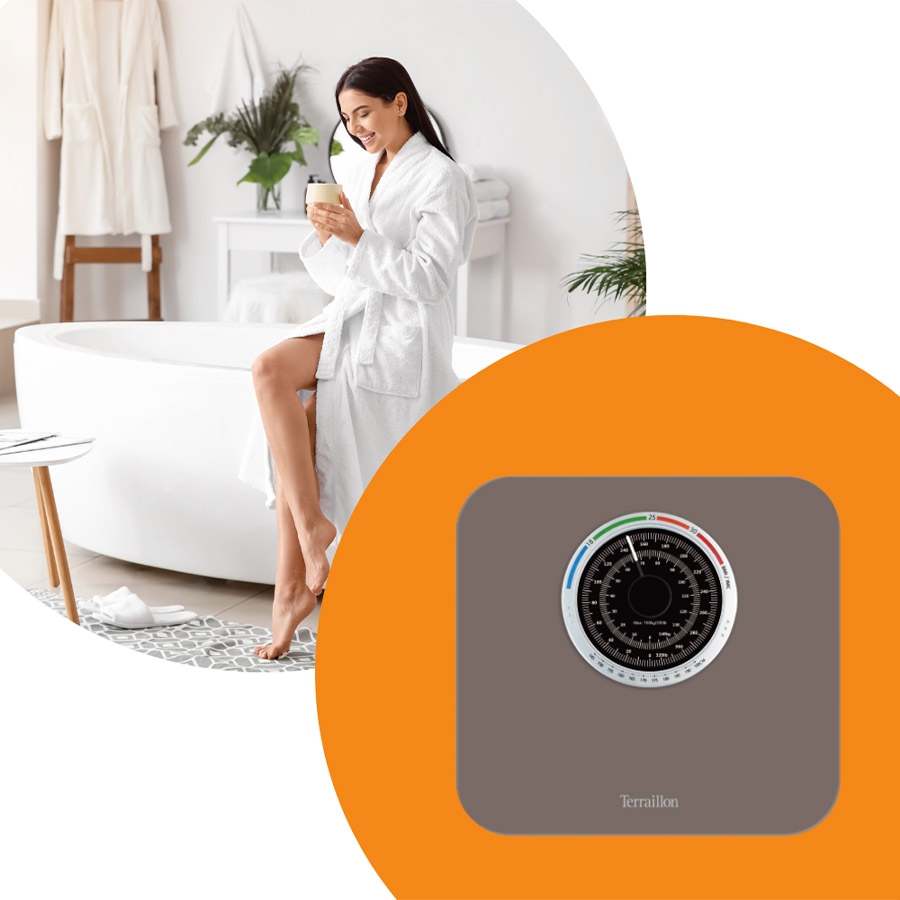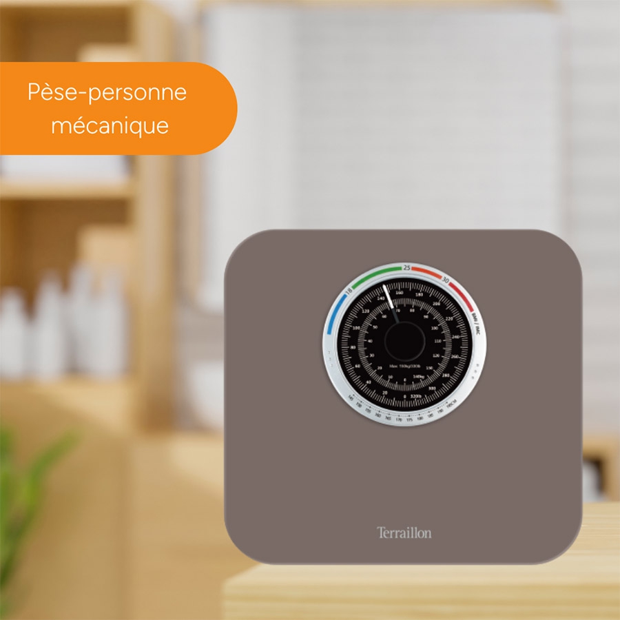 Le pèse-personne mécanique Nautic Up de Terraillon dispose, autour de son cadran extra large, d’un indicateur IMC. Il permet des mesures jusqu’à 150 kg.