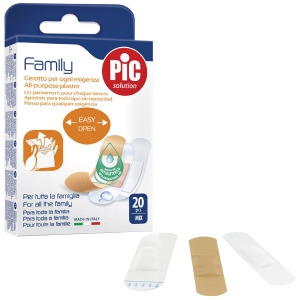 La boite de pansements Family de PIC est un kit de pansements prêts à l'usage. Il comprend une sélection de différentes tailles et différents types de pansements, pour pouvoir faire face aux besoins de tous les membres de la famille.