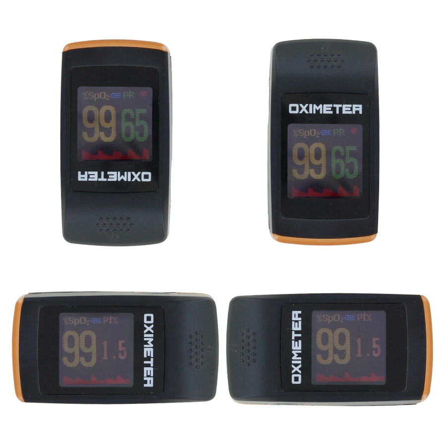 Son écran couleur dispose d'une rotation automatique dans 4 directions. Il affiche le % de SpO2, la fréquence cardiaque, l'indice de perfusion, la barre de graphe de pulsation et le pléthysmogramme.