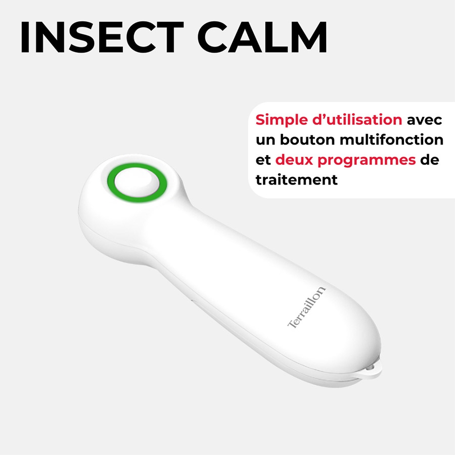 Très simple à utiliser, Insect Calm dispose d'un seul bouton multifonction permettant de choisir entre les deux programmes de traitement et d'activer l'application de chaleur sur la zone touchée.