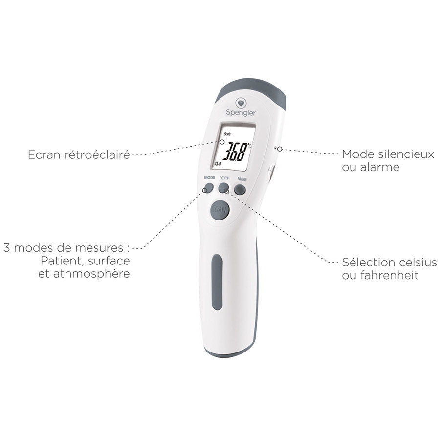 Pour des prises de température sans contact, le thermomètre Spengler Tempo Easy est parfait pour un environnement médical exigeant des normes d’hygiène élevées. Il propose trois modes de mesure et une alarme sonore en cas de fièvre. Son écran rétro-éclairé et sa capacité à mémoriser jusqu’à 32 mesures facilitent le suivi des données, et permettent une prise en charge plus précise des patients.