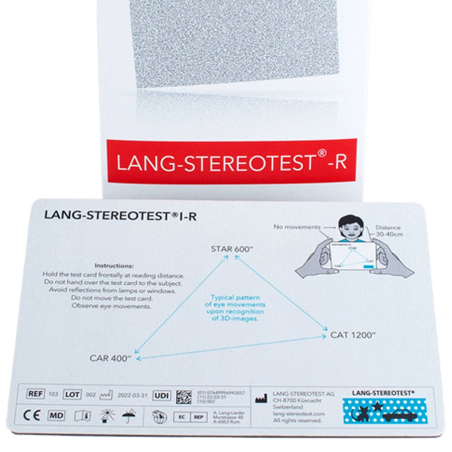 Le stéréotest de Lang I-R est une version révisée du stéréotest de Lang I. Cette version révisée a amélioré la qualité optique et d'impression par rapport à la version précédente et ne présente aucun indice monoculaire lorsqu'elle est utilisée correctement.