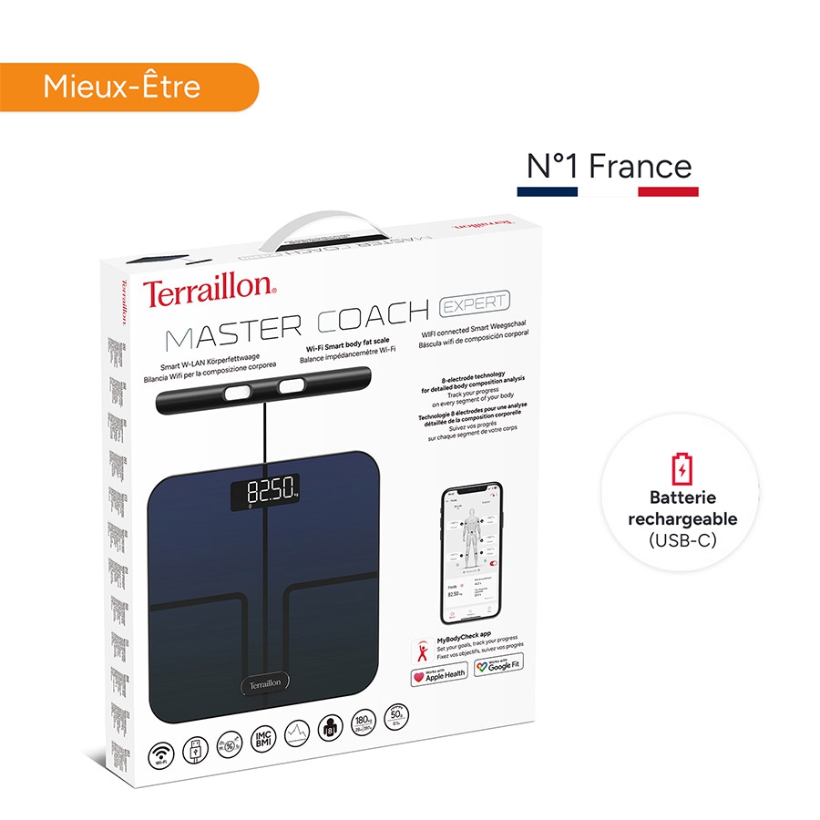 La balance impédancemètre Master Coach Expert de Terraillon révolutionne la gestion du poids et la surveillance de la santé avec une précision inégalée. Conçu pour les utilisateurs exigeants, cet impédancemètre haut de gamme utilise une technologie avancée à 8 électrodes, offrant une analyse segmentée de la composition corporelle. Chaque partie du corps, y compris les bras, le torse et les jambes, est mesurée individuellement pour fournir des données précises sur les masses graisseuses, musculaires, hydriques et osseuses (via l'application).