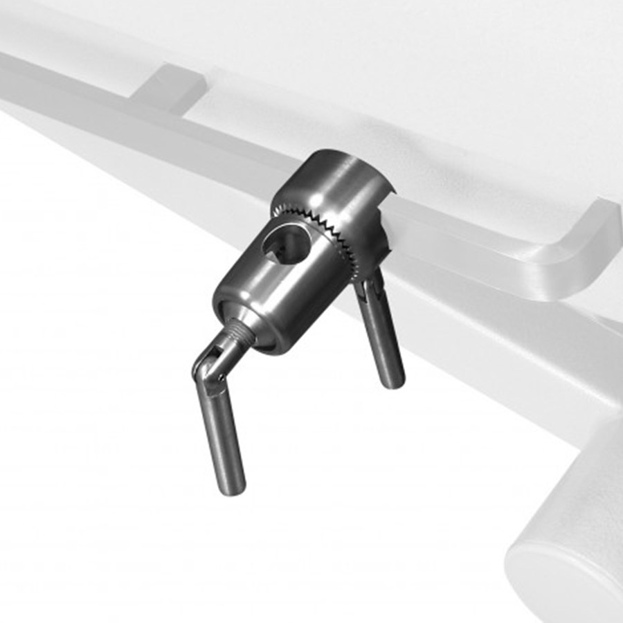Cet étau rotatif, solidement fixé aux rails du divan, permet de fixer différents dispositifs et instruments dans la position souhaitée et de les ajuster facilement en fonction des besoins de chaque examen. Grâce à son mécanisme de rotation, le praticien peut orienter les accessoires fixés dans l’angle optimal, facilitant les manipulations et améliorant l'efficacité des soins.