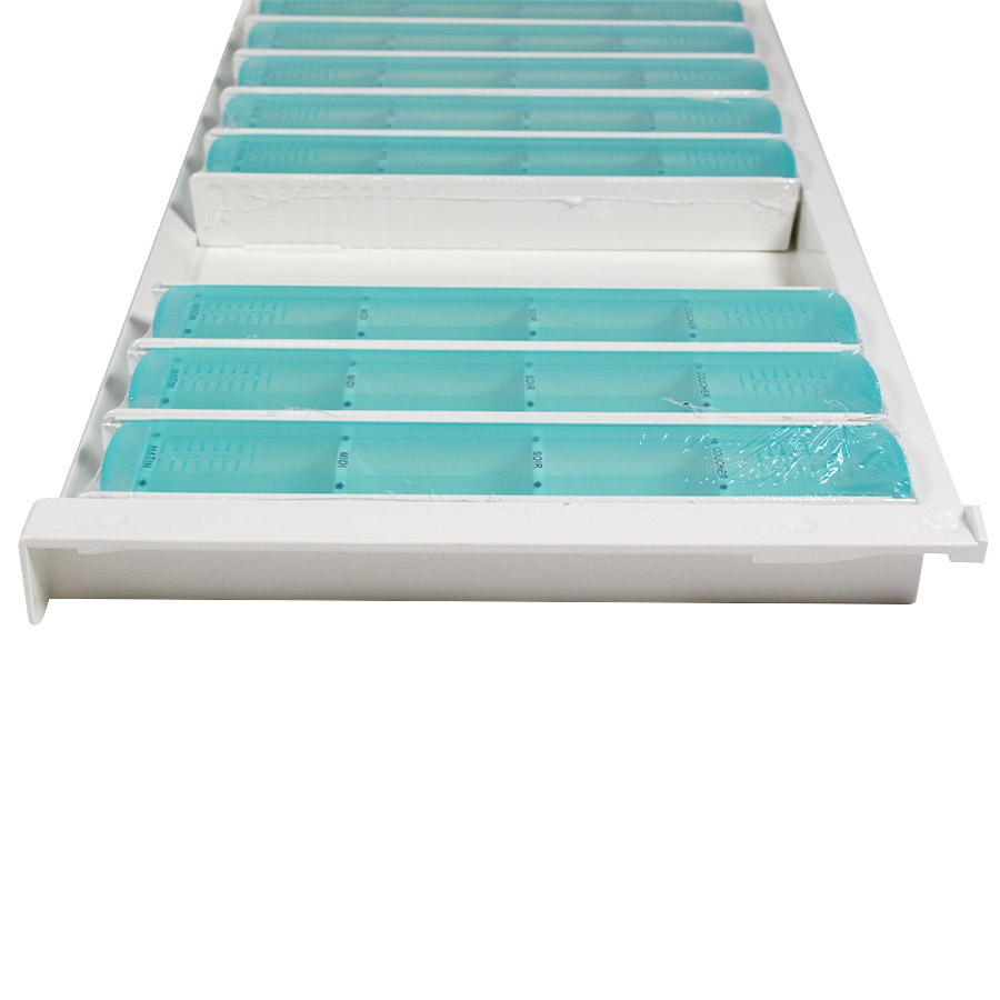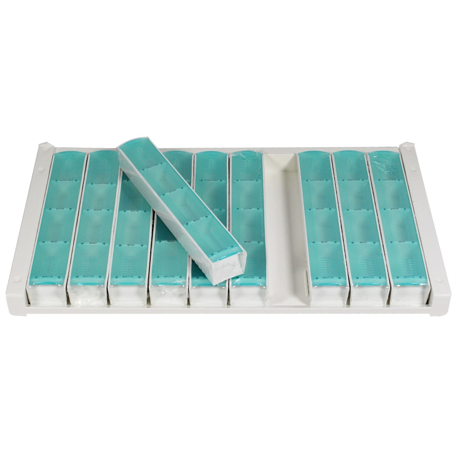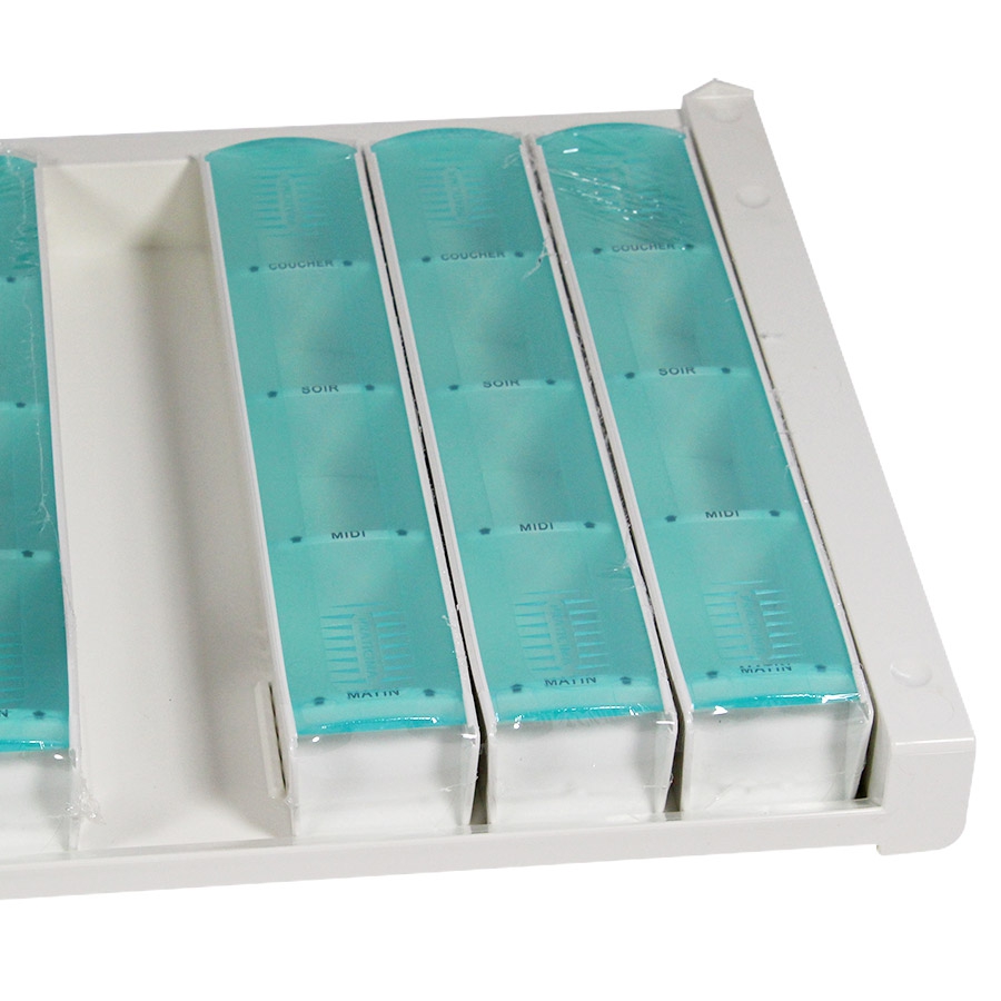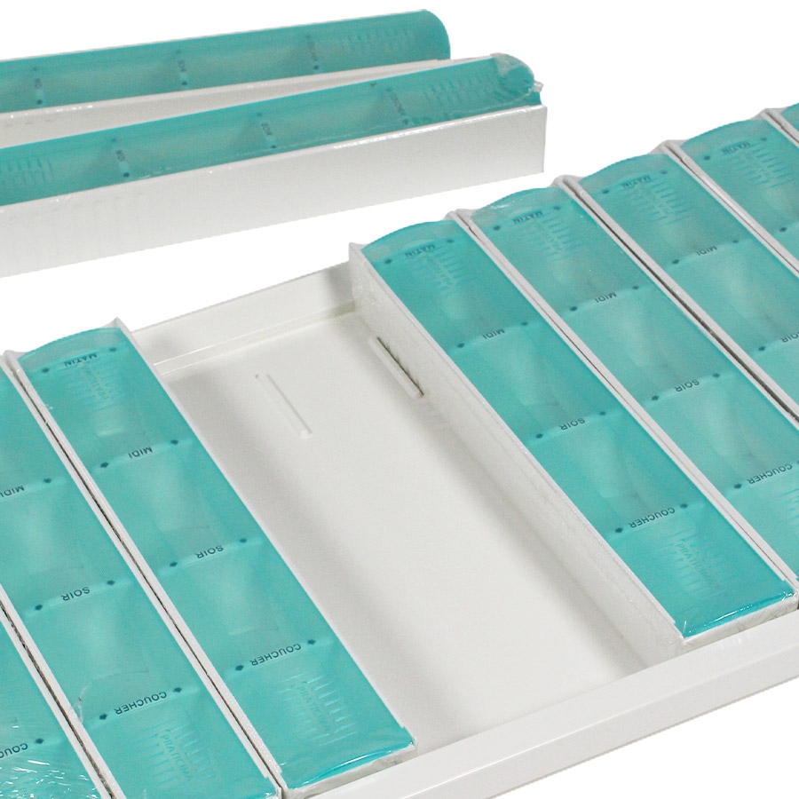 Le plateau piluliers journaliers Modulo Classic de Praticima est conçu pour la préparation hebdomadaire des médicaments en EHPAD ou unités de long séjour.