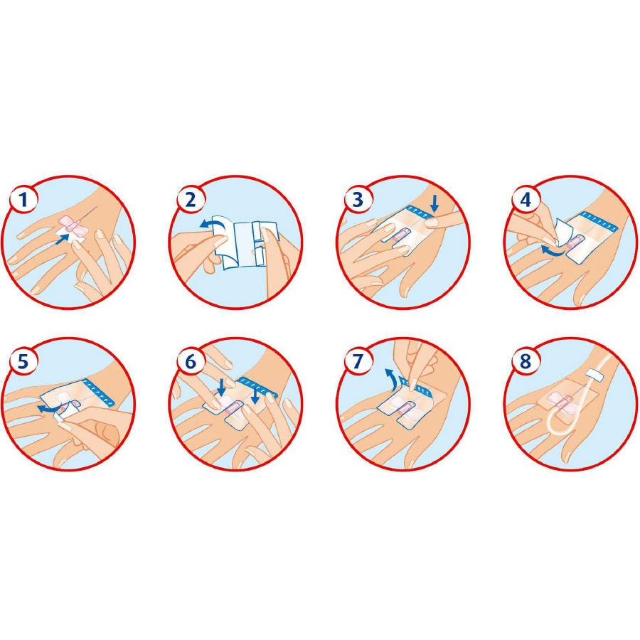 - Un pansement pour la fixation de la seringue, transparent, stérile et imperméable, pour sécuriser le site d’insertion.