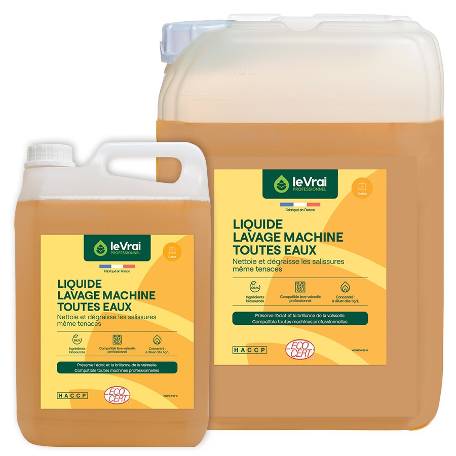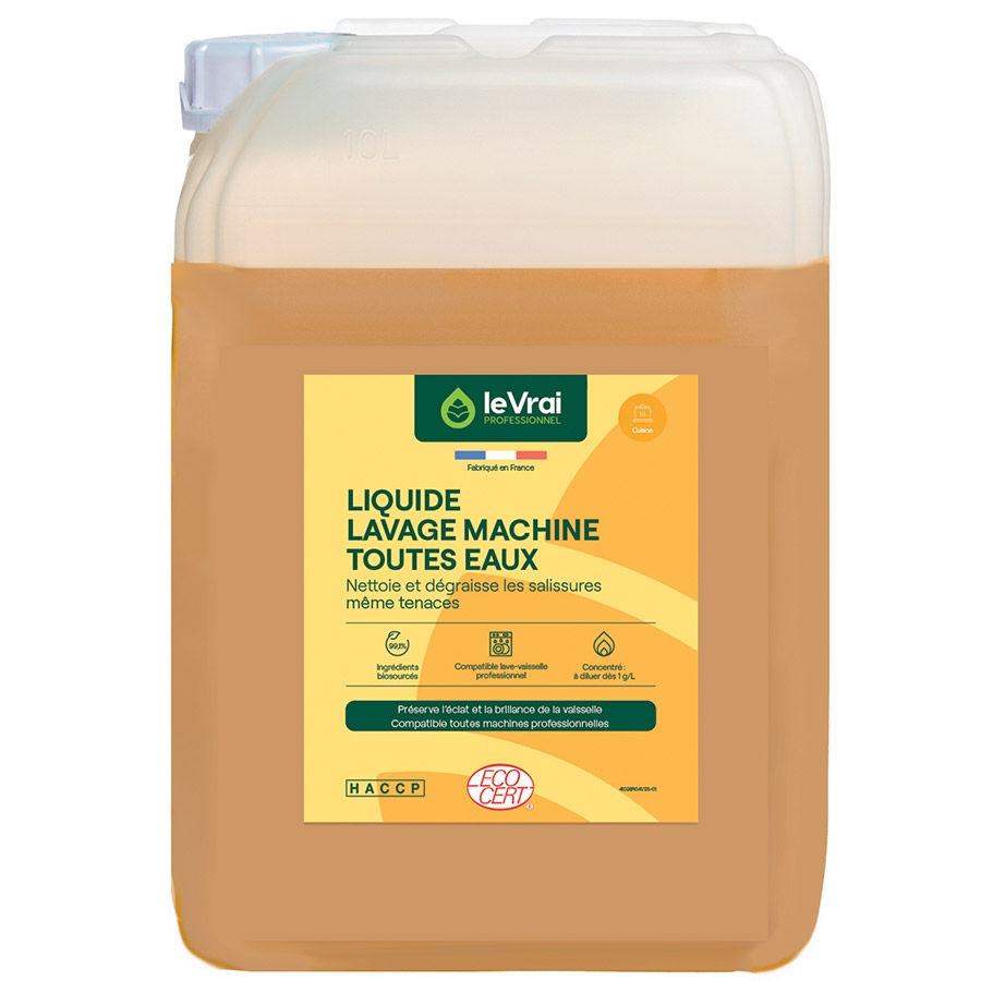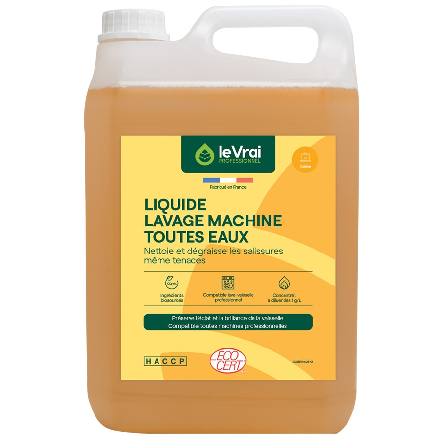 Le liquide de lavage machine toutes eaux Le Vrai Professionnel est spécialement conçu pour les lave-vaisselles professionnels. Sa formule certifiée Ecocert garantit une efficacité prouvée et un lavage impeccable de la vaisselle, même en utilisation intensive.