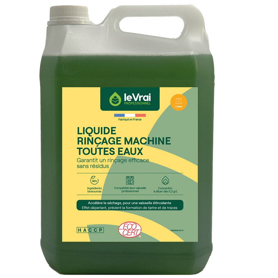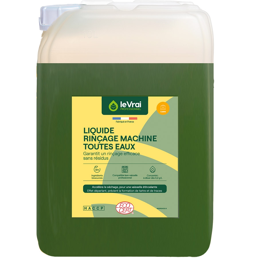 Le liquide de rinçage machine toutes eaux Le Vrai Professionnel est spécialement formulé pour un rinçage impeccable de la vaisselle dans les lave-vaisselles professionnels. Sa formule certifiée Ecocert associe performance et démarche écoresponsable.