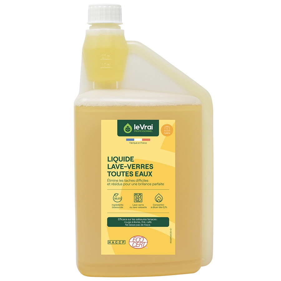Le liquide lave-verres toutes eaux Le Vrai Professionnel est spécialement conçu pour offrir un nettoyage impeccable de la vaisselle dans les lave-vaisselles professionnels. Sa formule certifiée Ecocert combine efficacité et respect de l’environnement.