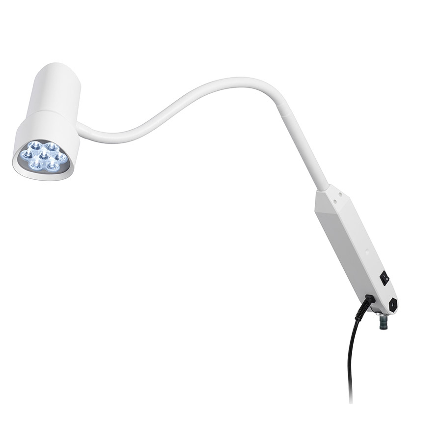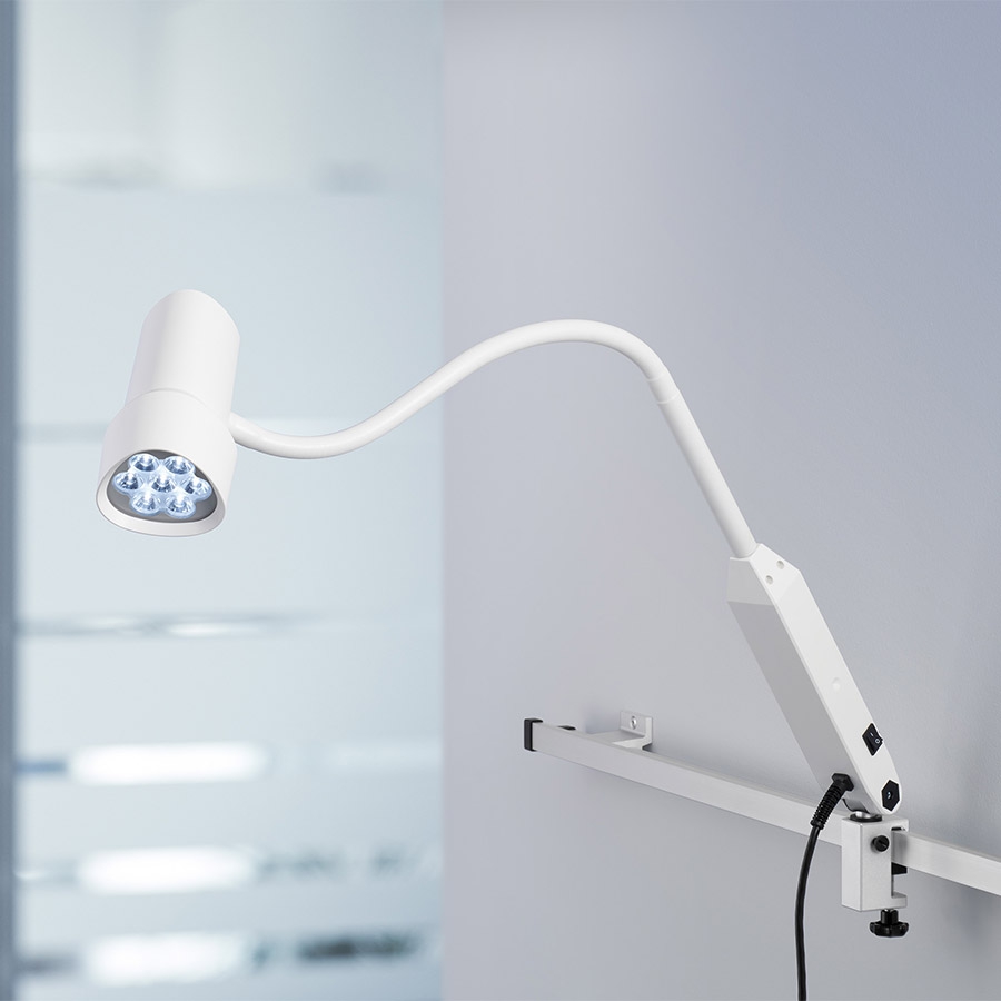 La lampe d'examen Halux N50 existe en version avec bras fixe et sa rotule situé à la base ou avec en version avec bras flexible pour une manipulation encore plus facile, idéal pour les examens gynécologiques.