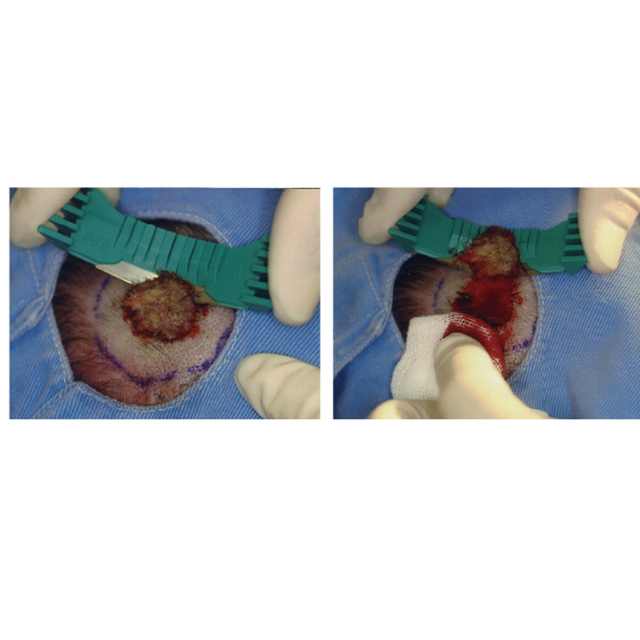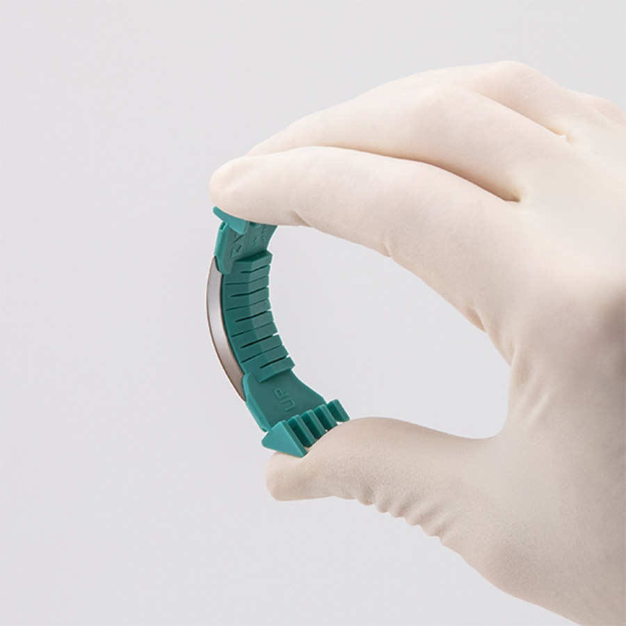 Grâce à sa butée fendue, la lame BiopsiBlade évite toute flexion excessive lors de la manipulation. Son repose-doigt antidérapant assure une tenue ferme et stable, réduisant les risques de glissement pendant l’incision et améliorant la précision du geste du praticien.