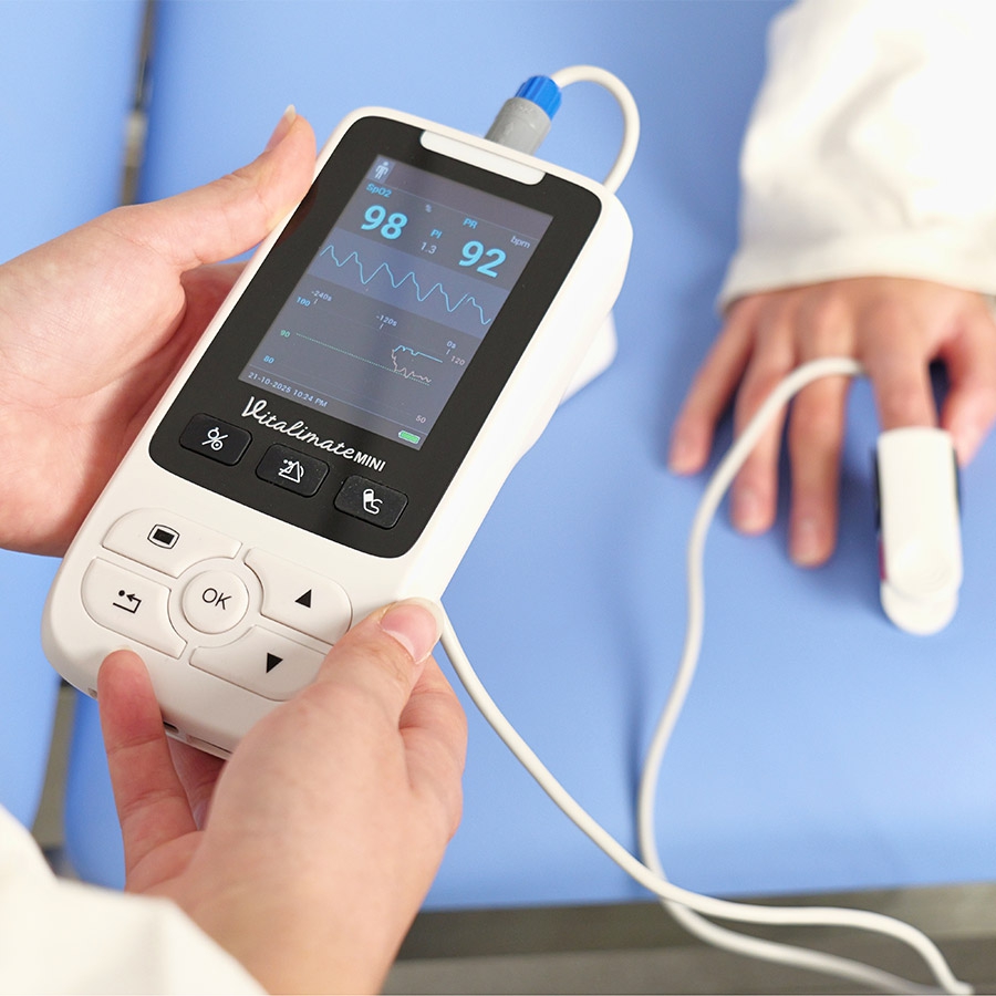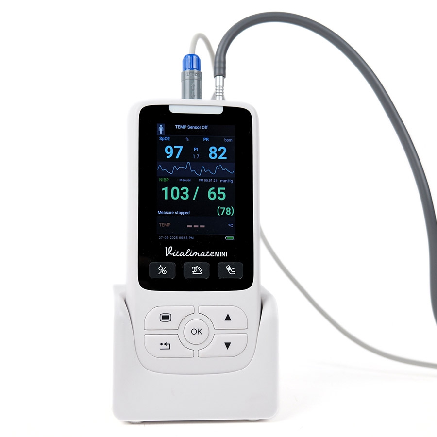 Avec un poids compris entre 280 g (version SpO2) et 360 g (version SpO2 + PNI), le moniteur multiparamètres Vitalimate Mini est facile à transporter et peut même tenir dans une poche. Son écran couleur LCD 3,5’’ offre une lecture claire et rapide des valeurs de SpO₂ et de PNI, y compris en environnement lumineux, pour une surveillance des signes vitaux simple et intuitive.