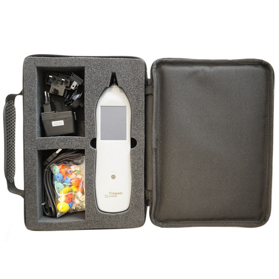 Grâce à son design ergonomique, léger et compact, le Timpani est facilement transportable. Il dispose d’une batterie lithium rechargeable offrant une longue autonomie et peut être utilisé en mobilité, notamment lors de campagnes de dépistage. Un étui de transport souple dédié assure une protection optimale lors des déplacements.