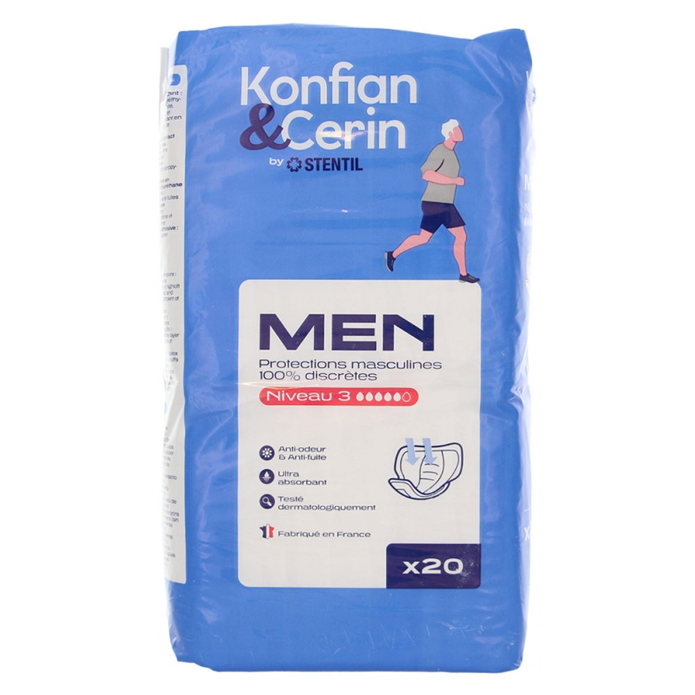 Les protections masculines Konfian & Cerin Men niveau 3 sont conçues pour les hommes souffrant de fuites urinaires modérées à plus importantes. Leur coupe anatomique ajustée garantit une adaptation parfaite et une discrétion totale au quotidien.