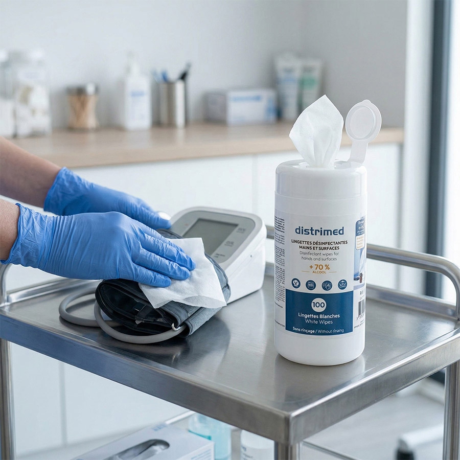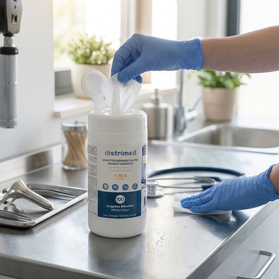 Les lingettes désinfectantes Distrimed permettent de désinfecter rapidement les mains, objets et surfaces.