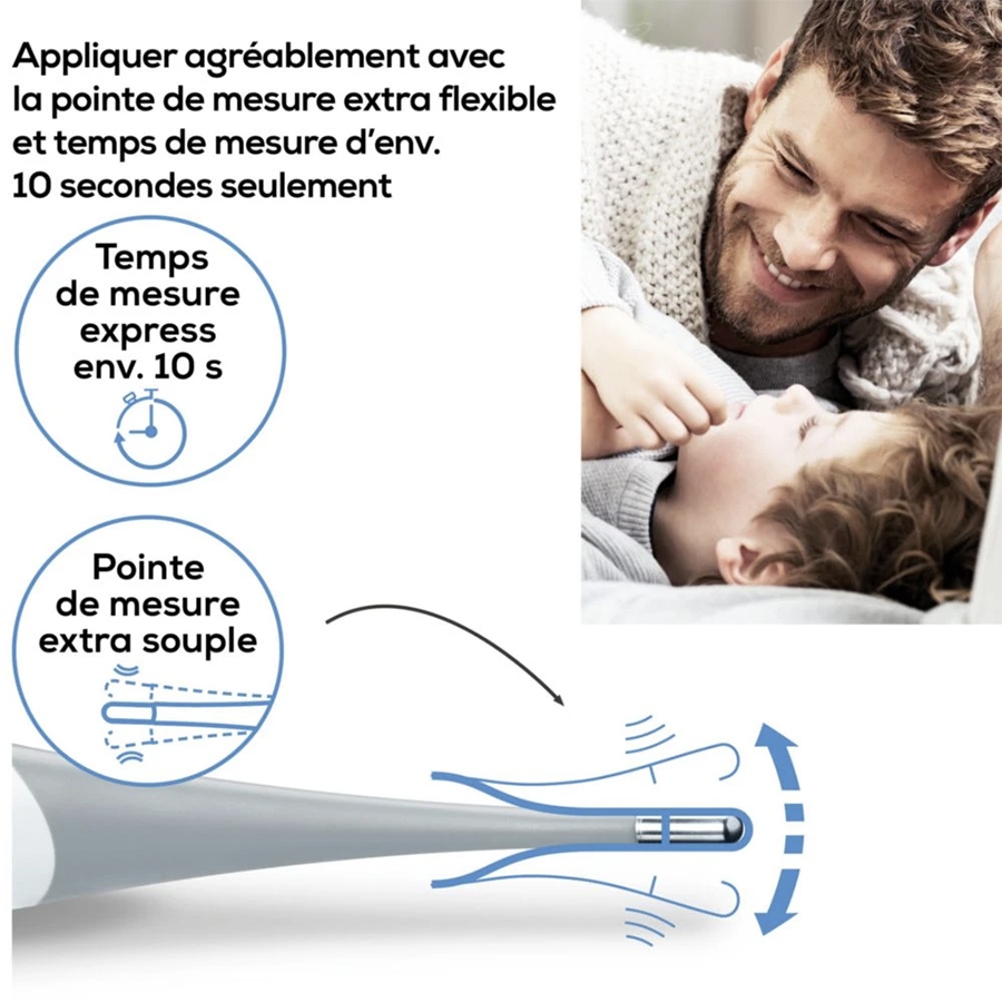 Doté d’un embout de mesure extra-flexible, ce thermomètre offre une utilisation confortable et sécurisée, notamment pour les prises de température répétées.