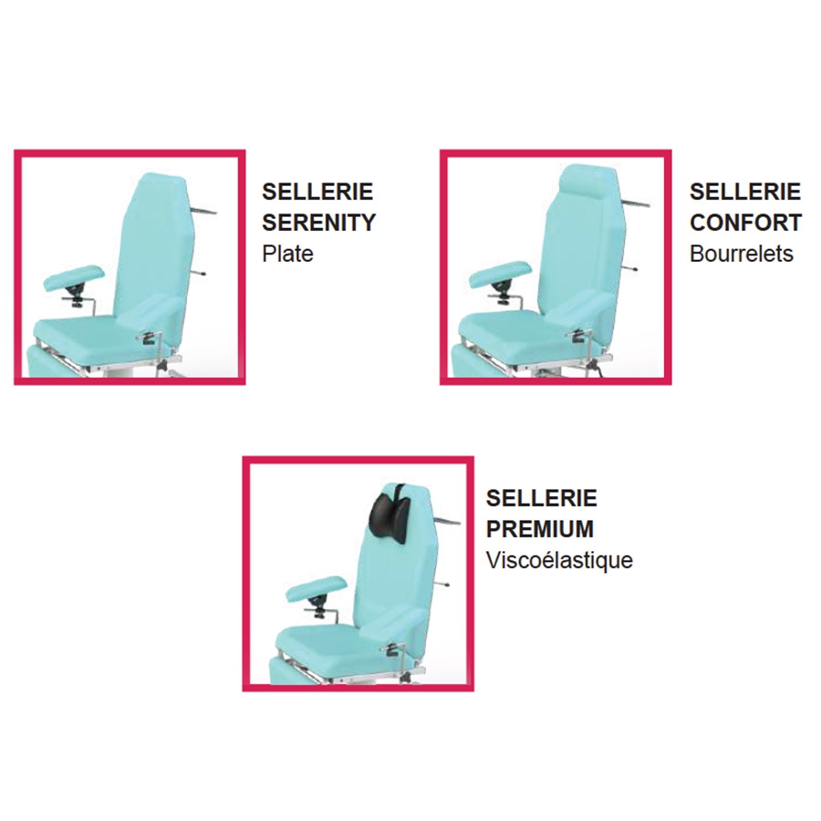Disponible avec les selleries SERENITY, CONFORT et PREMIUM, toutes certifiées non-feu M1, ce fauteuil assure un confort optimal et une sécurité renforcée.