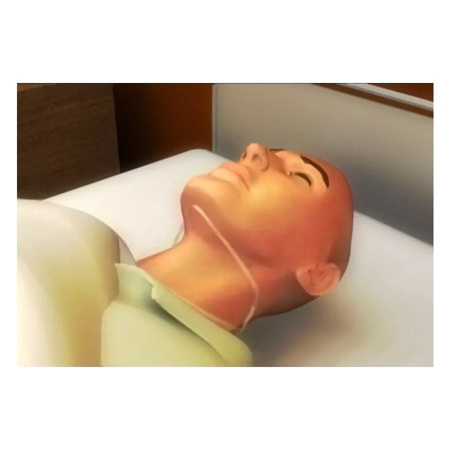 Ce dispositif se présente sous forme de collier à placer à l’avant du cou, s’appuyant sur la clavicule afin d’assurer un maintien efficace du menton. Il peut être partiellement dissimulé par les vêtements pour une discrétion optimale.