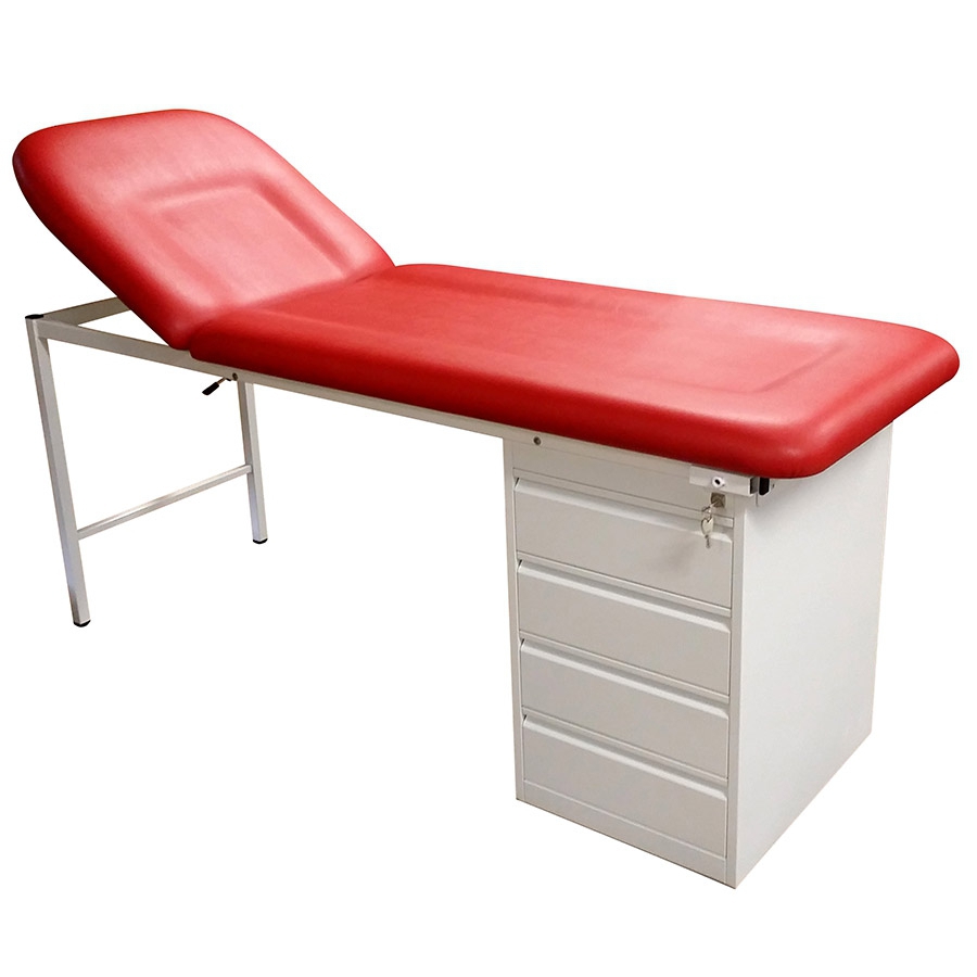 Un divan d'examen robuste (supporte jusqu'à 200 kg) et pratique. Son (ou ses deux) bloc(s) de rangement intégré(s) (avec quatre tiroirs fermant à clé) permet(tent) au praticien d'accéder facilement à ses instruments pendant la consultation.